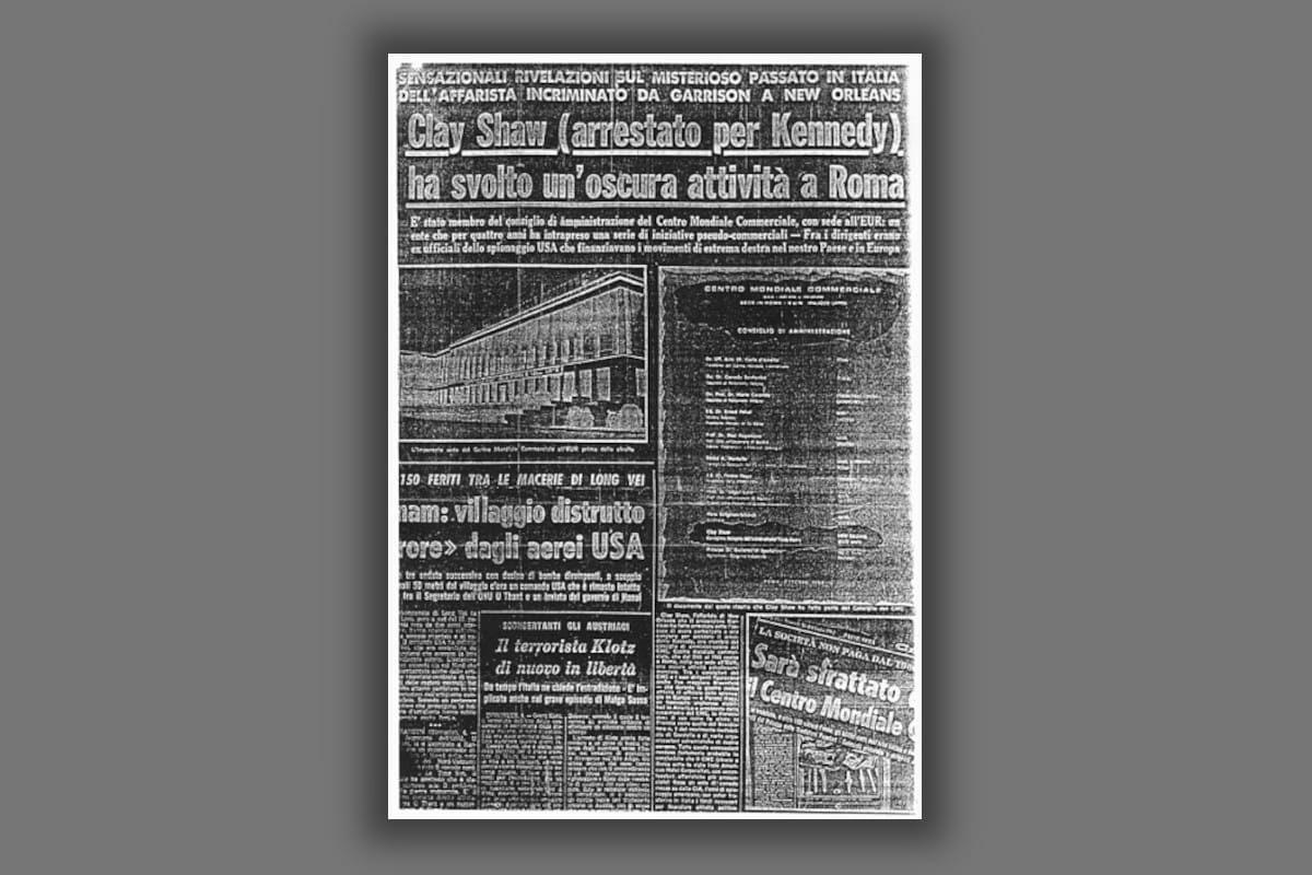 Jim Garrison: Mr. Shaw, this is an Italian newspaper article saying you were a board member of Centro Mondo Commerciale [sic] in Italy? That this company was a creature of the CIA for the transfer of funds in Italy for illegal political espionage activity. It says this company was expelled from Italy for those activities.