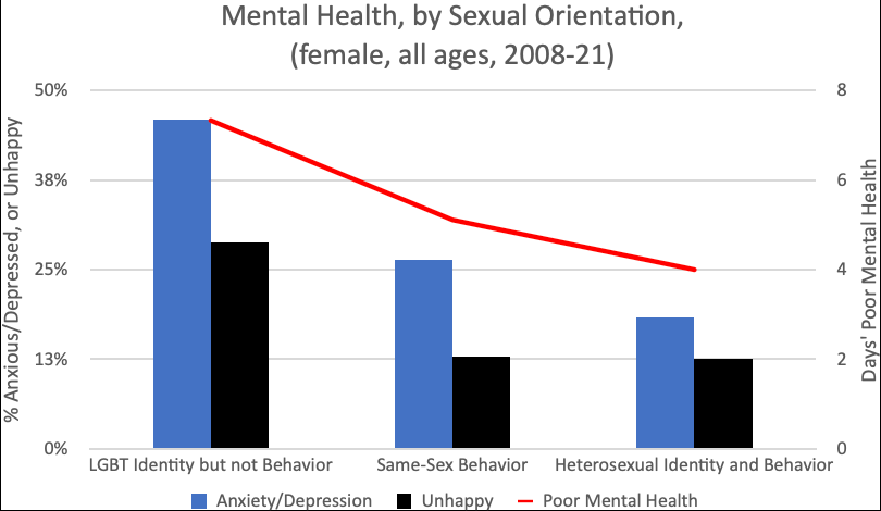 However, women who identify-without-behaving LGBT score significantly higher on anxiety/depression, unhappiness, and number of days of poor mental health during the past month. If intolerance is the reason for poor LGBT mental health, it is difficult to understand how those who are not same-sex partnered, and thus less likely to present as LGBT, should report worse emotional problems than those who are same-sex partnered. Here it is worth adding that women who had no sex partners did not suffer worse mental health than those who did, so the effect has nothing to do with people not having sex.
