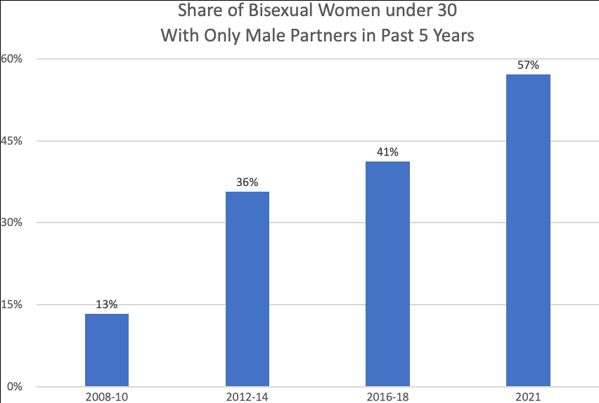 Furthermore, the GSS data show that bisexual women are the fastest-growing category, accounting for a disproportionate share of the post-2010 rise. A closer look at trends among female bisexuals in figure 2 shows that an increasing share of them display conventional sexual behaviour. In 2008–10, just 13 percent of female bisexuals said they only had male partners during the past five years. By 2018 this was up to 53 percent, rising to 57 percent in 2021. Most young female bisexuals today are arguably LGBT in name only.