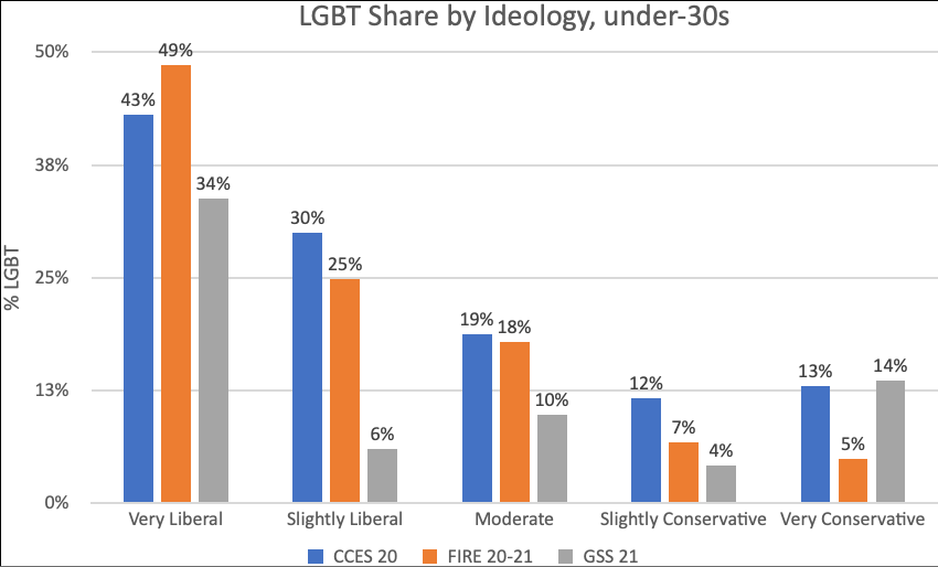 Second, the rise is less dramatic than it appears to be because LGBT identifiers are heavily drawn from the cohort who identify as “very liberal” on a five-point ideology scale (“very liberal” to “very conservative”). In the GSS, the LGBT share rose from 11 to 34 percent between 2008 and 2021 among very liberal young people but increased from only three to nine percent among the slightly liberal, moderate, or conservative who make up around four-fifths of the total. Figure 3 shows the general pattern across the FIRE, CCES, and GSS in 2020–21.