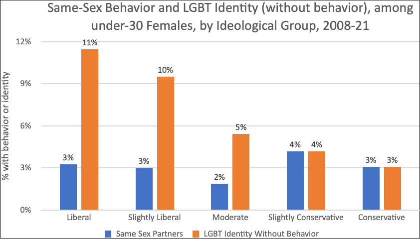 The graph shows that the share of women who have had a same-sex partner doesn’t differ a great deal in their ideology: around three percent of both liberal and conservative women reported a same-sex experience during 2008–21. Where there is a big ideological difference is among women who have not had a same-sex partner but still identify as LGBT. Of the most liberal young women, 11.5 percent fall into the LGBT identity-without-behaviour category, but just 3.1 percent of conservative young women do. The sample size is not large, but the pattern is consistent: LGBT identity, not behaviour, is what predicts being very liberal for women.