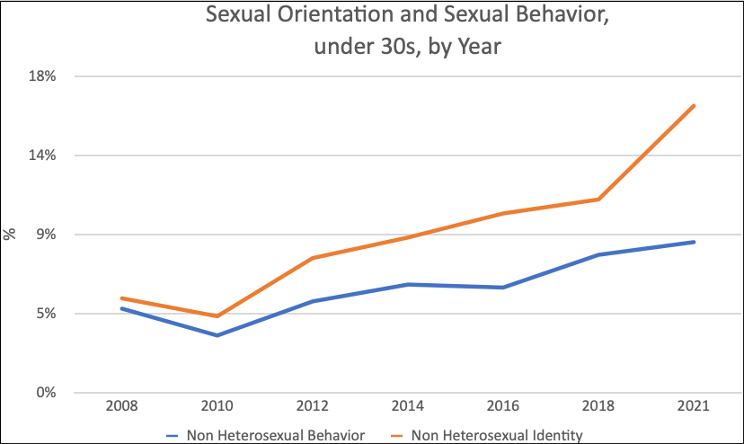 Let’s begin with trends in sexual orientation among young people. A recent Gallup survey found that: “Roughly 21% of Generation Z Americans who have reached adulthood—those born between 1997 and 2003—identify as LGBT. That is nearly double the proportion of millennials who do so, while the gap widens even further when compared with older generations.” Abigail Shrier, meanwhile, reports a 1,000-fold increase in trans identification. Reactions to these trends have varied. Republican Congresswoman Marjorie Taylor Greene thinks they indicate that there will be no straight people in a few generations; Bill Maher lampoons the increase as a rebellious fad; and progressives celebrate the rise as an electoral boon for the Democrats. Other liberals view the rise as the product of increasing toleration, similar to left-handedness, in which identification increases as stigmas are lifted and people come out of the closet.