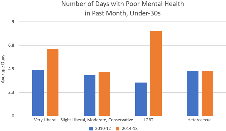 The data indicate that the link between LGBT identification and mental health problems has grown closer over the past decade. A large, long-running study of American high-school students showed that mental health declined substantially faster among LGBT teens compared to heterosexual teens between 2012 and 2018. Figure 7 shows that among those under 30 in the GSS, a similar pattern emerges, with very liberal and LGBT individuals experiencing a sharper rise in unhappiness than others between 2010–12 and 2014–18.