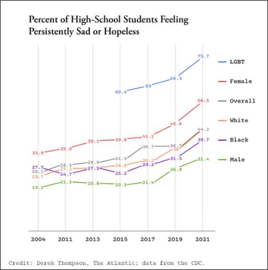 Will America be entirely gay in a few generations? Will everyone be mentally ill? It would appear so from a straight-line extrapolation of the stunning rise in both LGBT identification and mental illness among young Americans.