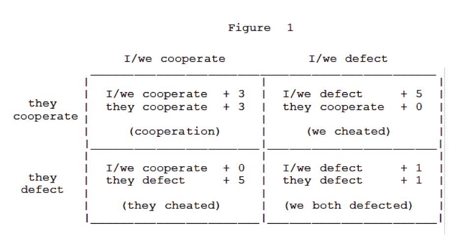 Obviously, one cannot straightforwardly generalise from fish or vampire bats to humans. However, inspired by Trivers’s model, Robert Axelrod and William Hamilton employed game theory to demonstrate a general model for how a reciprocal strategy can outcompete more selfish strategies. They used a modified version of a game known as the Prisoner’s Dilemma, which has been extensively studied by social scientists.