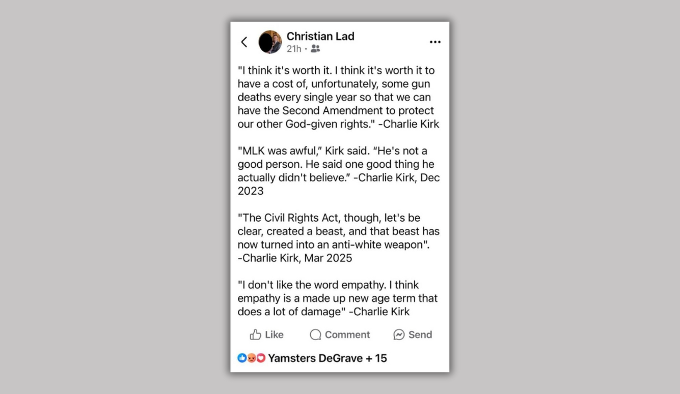 Other users found themselves in the crosshairs for quoting Kirk accurately. In a tweet that has 3,400 retweets and 5,400 likes as of this writing, we are invited to “meet” an Army officer who “has thoughts about the assassination of Charlie Kirk, and they don’t seem in the least sympathetic.” Included is a screenshot of a Facebook post that lists four accurate Kirk quotes, offered without any commentary.