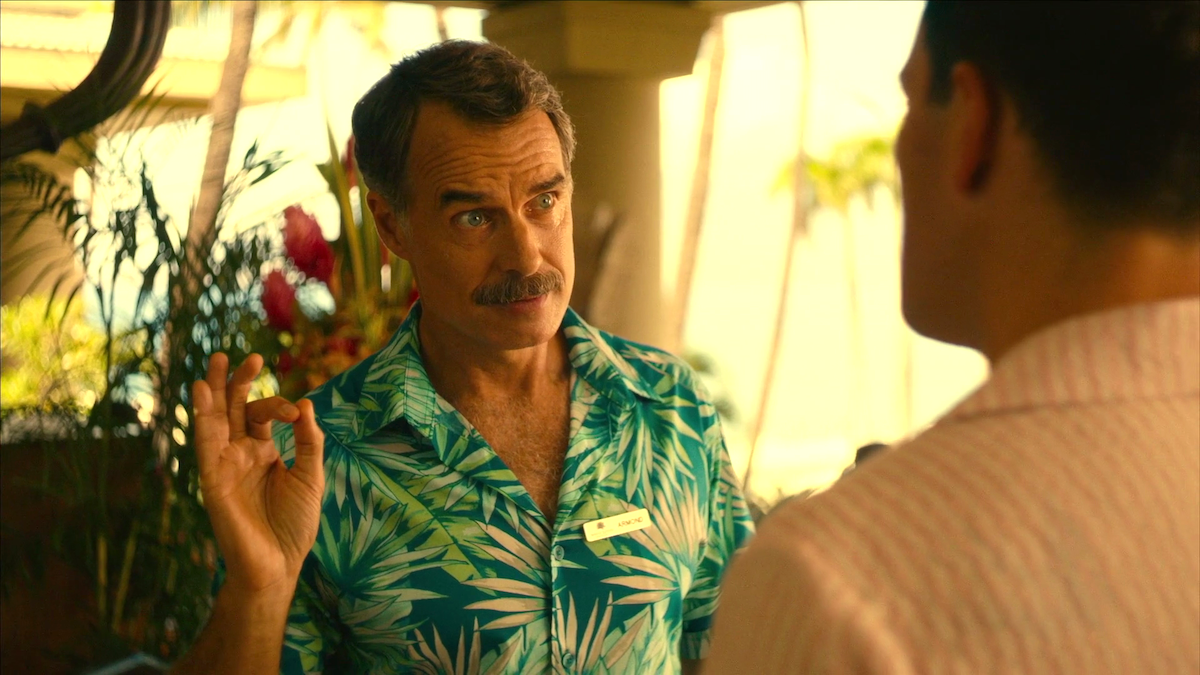 And at the centre of this Celtic knot of plotting is Armond (Murray Bartlett), the resort’s gay manager, whose job is to cater to the whims and moods of the White Lotus guests and see to it that the help’s personal troubles never reach their privileged ears. Elegant, literate, and dressed just this side of tropical garishness (colourful linen suits, spectacular Hawaiian shirts), Armond is the most fascinating character in season one, and indeed in the entire White Lotus series. A recovering alcoholic, he somewhat resembles Basil Fawlty with a large moustache and volatile temperament that flips unpredictably between obsequious and spiteful. The stress caused by his feud with Shane seems to send him into a tailspin, releasing a mess of injured pride and repressed rage. When Tanya hands Paula’s bag to him after she finds it on the beach, he plunders Paula’s ketamine supply and turns his office into a den of iniquity with the help of two good-looking hotel underlings, in violation of every sexual-harassment ban ever devised. So complete is Armond’s loss of control that it is hardly a surprise when he turns out to be the corpse mentioned in the season prologue—fatally (but accidentally) stabbed after he lets himself into Shane’s room to defecate into his suitcase.