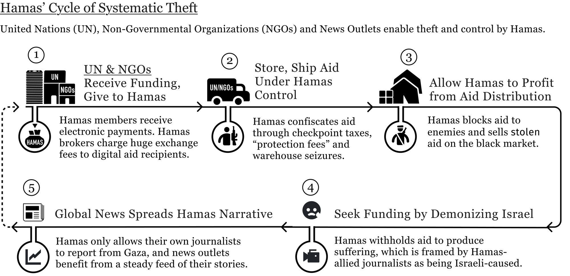 First, according to the organisation NGO Monitor, Hamas controls the Gaza Ministry of Social Development (MoSD), which determines the list of recipients of cash assistance programs that NGOs must use to distribute financial aid. This allows Hamas to prioritise payments to their own members and block funding to opponents. Second, to access the cash, recipients must use money-changers—often affiliated with Hamas—who charge fees of thirty percent or more to convert digital transfers into physical currency, enabling Hamas to siphon off hundreds of millions of dollars annually through a shadow banking system. Finally, Hamas steals physical aid to drive up demand and inflate prices, then sells the stolen goods to desperate Gazans who must pay using cash obtained at a thirty percent loss.