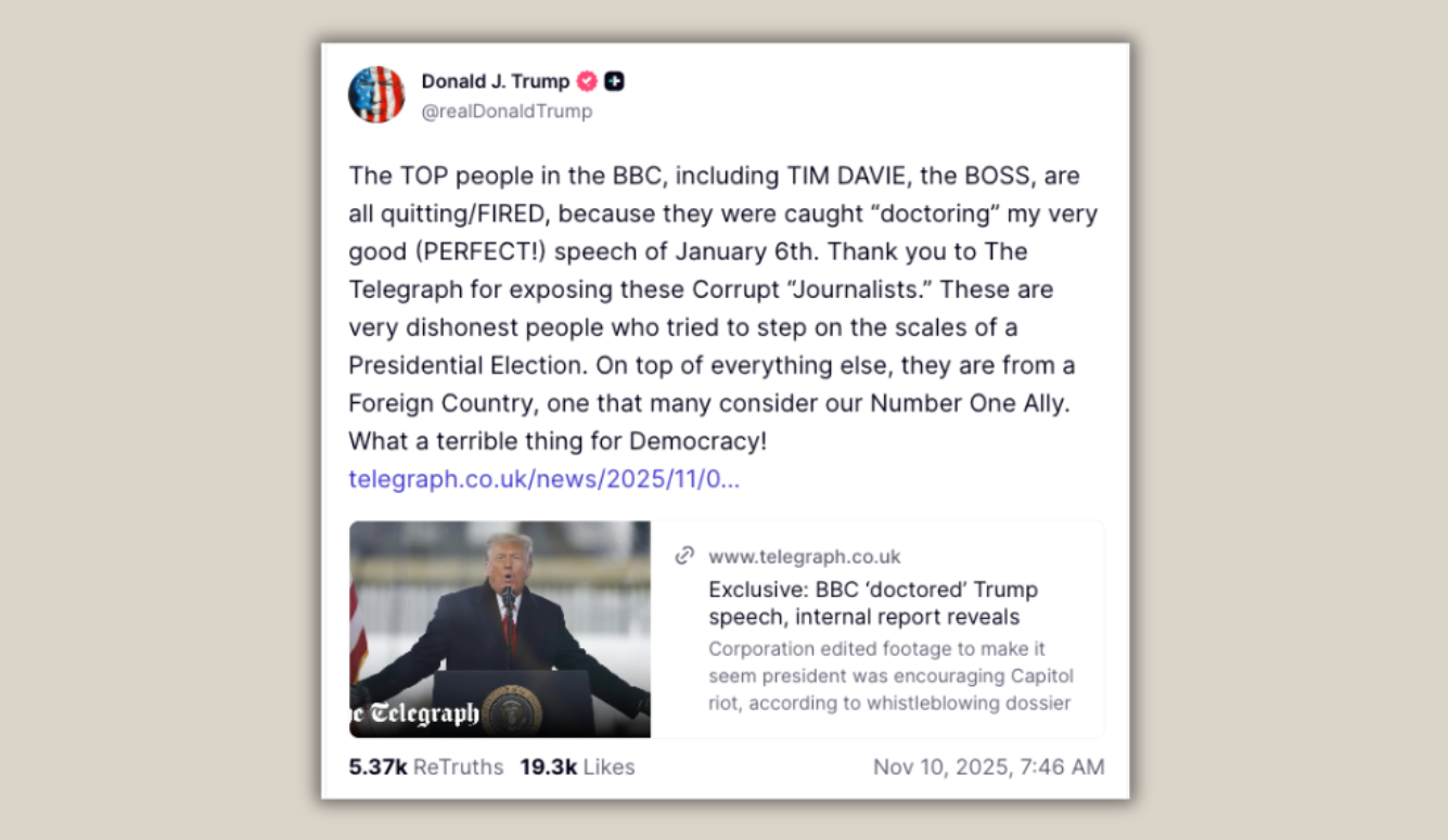 In an interview with GB News the day after the contents of the memo were first reported by the Telegraph, Conservative Party leader Kemi Badenoch declared that “heads should roll.” Finally, on 9 November, they did when director general of the BBC, Tim Davie, and the CEO of news, Deborah Turness, both resigned. US president Donald Trump responded to this news with a post on Truth Social, in which he wrote: “The TOP people in the BBC, including TIM DAVIE, the BOSS, are all quitting/FIRED, because they were caught ‘doctoring’ my very good (PERFECT!) speech of January 6th. Thank you to The Telegraph for exposing these Corrupt ‘Journalists.’ These are very dishonest people who tried to step on the scales of a Presidential Election.” He has threatened to sue the corporation for a billion US dollars.