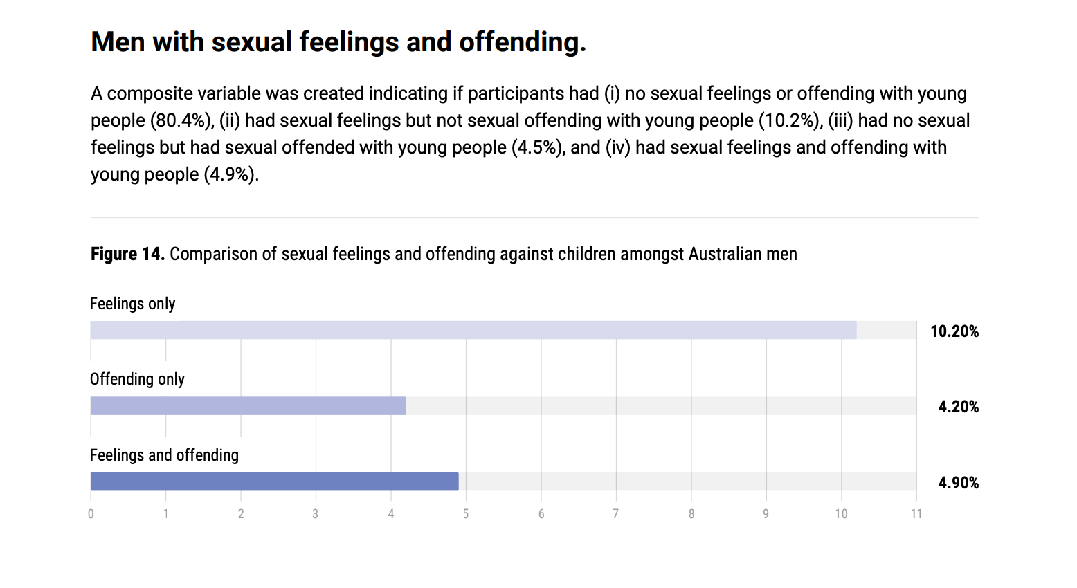 There has been clear pushback in defence of male educators targeted by these new regulations, arguing that some men were great educators and were unfairly tarnished by the recent events. But in November 2023, a nationally-weighted UNSW study of men’s self-reported sexual behaviour (n = 1,965) found that 15.1 per cent of men reported some level of sexual interest in children, while 9.4 per cent admitted to at least one form of sexual offending against a child. Most concerning was the overlap: 4.9 per cent of men reported both sexual interest in children and a history of offending. The findings suggest that sexual abuse exists not at the margins of society, but embedded within it, with offenders often remaining undetected while positioning themselves close to children and families.