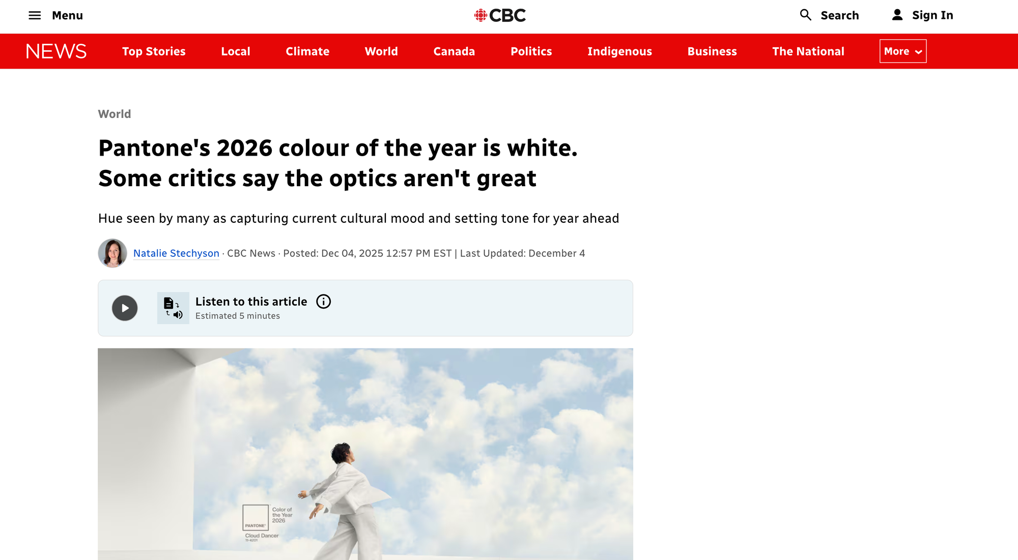 - On 4 December, the World desk of CBC News reported a story titled, “Pantone’s 2026 Colour of the Year is White. Some Critics Say the Optics Aren’t Great.” The colour in question is actually “Cloud Dancer,” officially classified as “PANTONE 11-4201.” But yes, it’s white-ish—a fact bemoaned at considerable length by Senior CBC Editor Natalie Stechysoin. Cloud Dancer, Stechysoin lamented, is a “loaded choice” due to the “current political climate”—specifically, “U.S. anti-immigration policy and border patrol[s].” She quoted commentators who deemed the decision “apocalyptic” and an emblem for “klansmen.”
