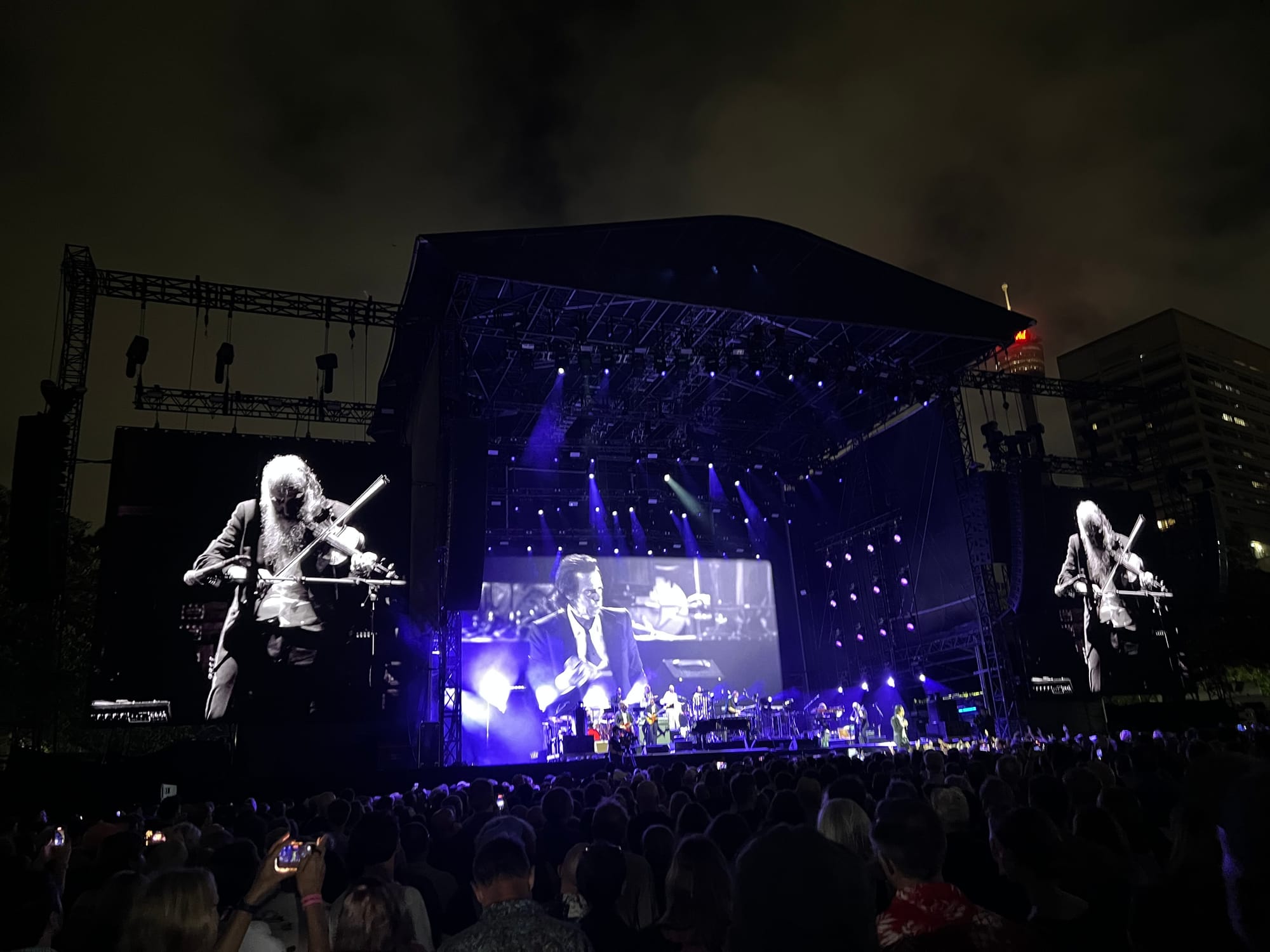 Bats migrate across the twilight. A fingernail moon hangs between city buildings. Nick Cave and the Bad Seeds emerge from the parkland of The Domain below singing “O Children.” Each night, Cave’s introduction changes. At first, he talks about how the song has followed him around, its meaning shifting over the years. On the second night, Cave’s introduction is rawer: he extolls the beauty of Sydney and warns people “not to fuck it up” for those that follow us. “Maybe that’s all the song really means,” he says, with a shrug.
