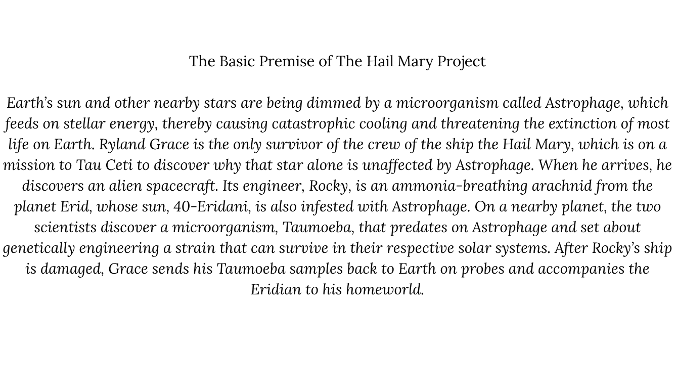 This piece contains major spoilers for both the book and film versions of Andy Weir’s Project Hail Mary. I also include a brief plot summary in a textbox below.